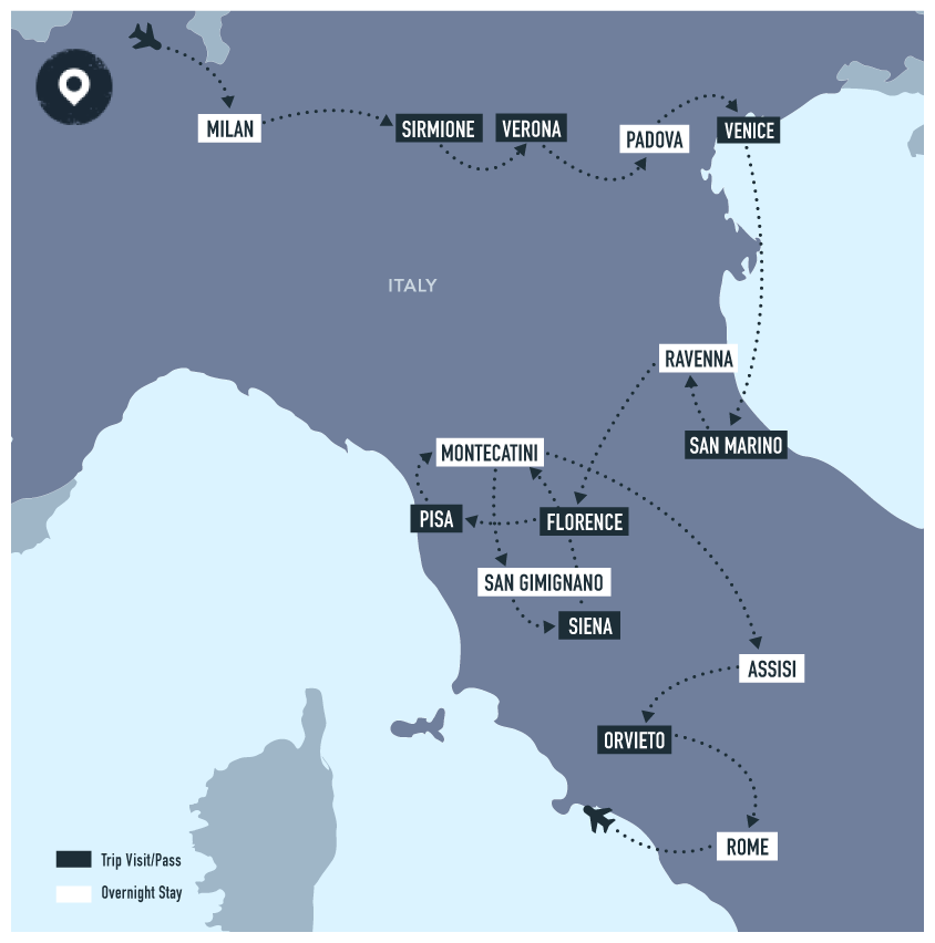 Milan (2 nts) - Verona - Venice - Padova (2 nts) - San marino - Ravenna (1 nt) - Florence - Pisa - Siena - Montecatini (2 nts) - Assisi (1 nt) - Orvieto - Rome (2 nts)